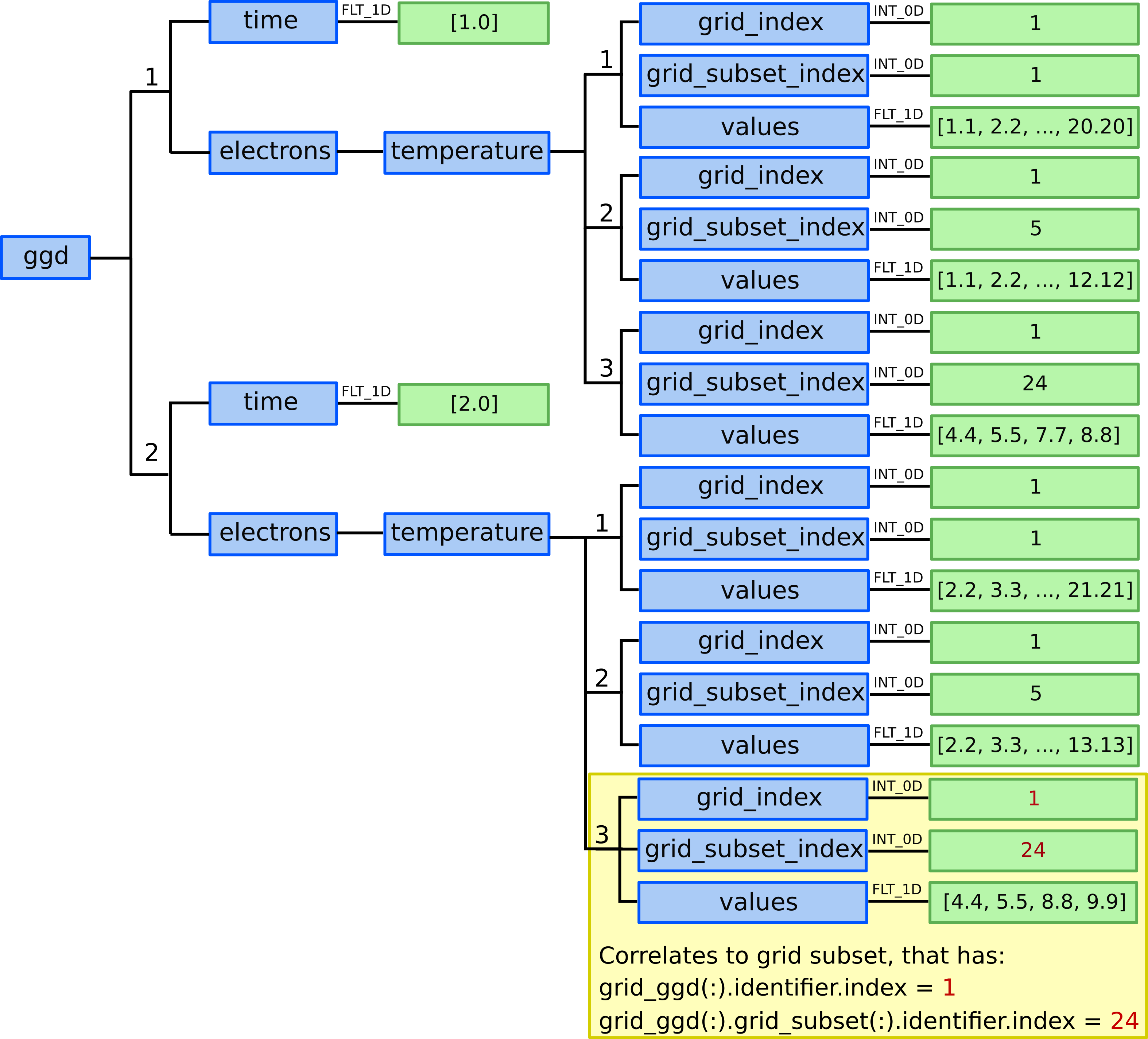 ggd(2).electrons.temperature(2).grid_index= 1ggd(2).electrons.temperature(2).grid_subset_index= 5ggd(2).electrons.temperature(2).values= e.g. [2.2, 3.3, …, 13.13] (one value per quad, 12 values)