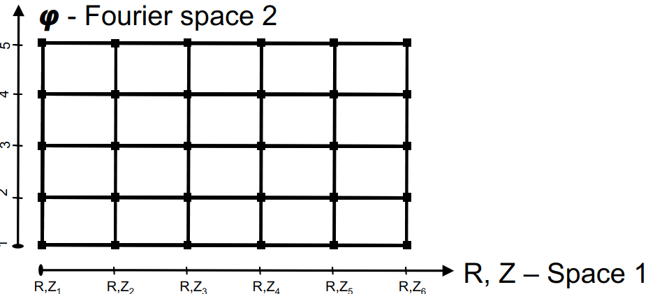 Values (Te, n, w, …), stored under GGD, with the above two spaces form a “structured” (implicitly defined) grid of node values, where explicitly RZ values of first harmonics are saved first, then RZ values of the second harmonics follow up to the last RZ harmonics. Similarly, coefficients on the nodes are saved. This definition follows column major (FORTRAN) notation, meaning that with varying first index (R) the values are close together in the memory and that the last index (\(\varphi\) in Fourier space) defines RZ block of values in memory. At the moment, the correspondance between \(X(s,t,\varphi)\) and GGD is, for example for the toroidal current density